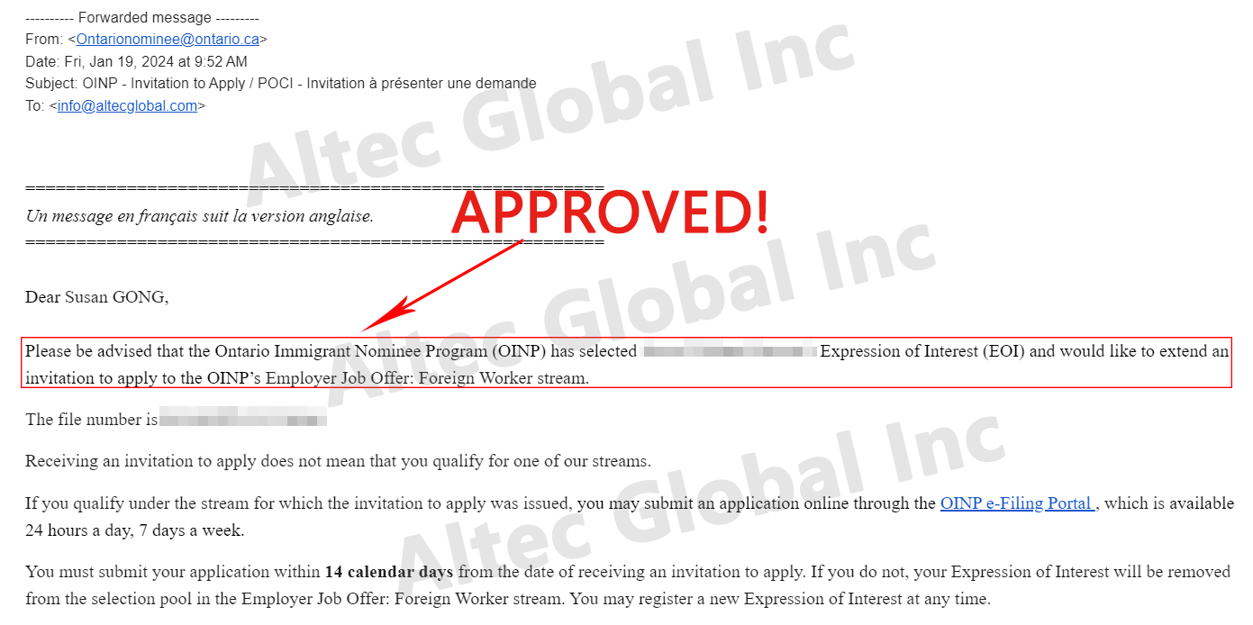 A OINP Foreign worker stream Application Approved with Altec Assistance!