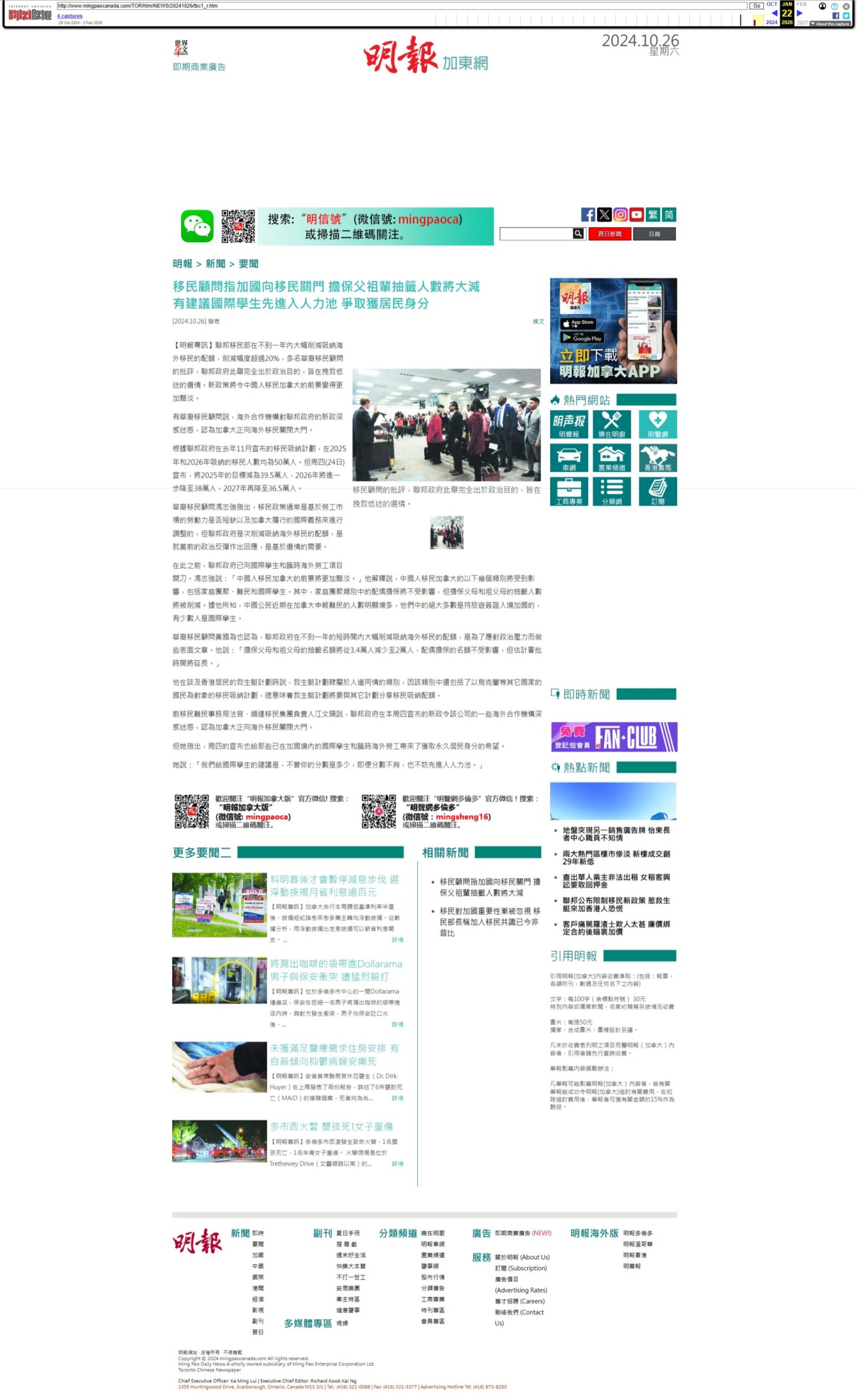 《明报》报导移民顾问对加拿大大幅缩减移民配额的关切。父母及祖父母团聚计划名额可能大幅下降,同时专家建议国际学生积极进入劳动市场,以提升长期申请永久居民身分的机会。