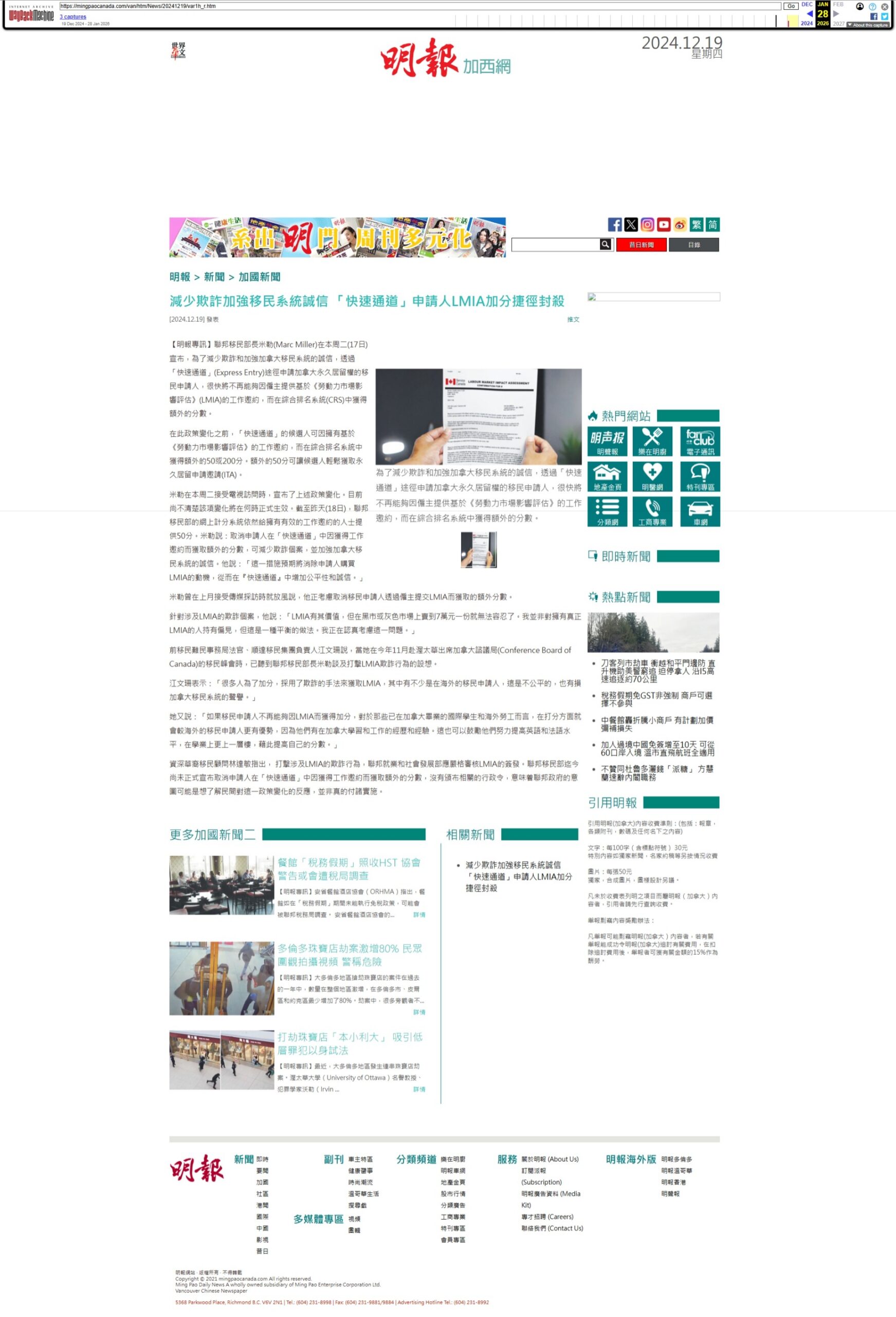 《明报》— 加拿大加强打击欺诈行为以巩固移民制度完整性:快速通道(Express Entry)申请人失去 LMIA 加分